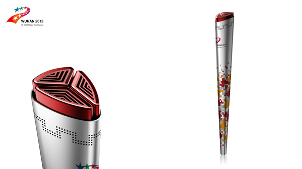 陈鹏介绍,第七届世界军人运动会火炬总长700mm,重量780克,整体外观为三角造型。火炬取名“和平荣光”,寓意“和平、发展、友谊”。火炬顶部由三团火焰紧靠相融而成,象征世界各地的军人相聚中国,点燃彼此热情、同筑和平友谊;长城垛口形的进风口环绕火炬顶部,代表将和平发展的理念传递到全世界;中国红底色的数码迷彩涂装,富有军运特色和文化底蕴;火炬底部的圆寓意世界和平同为一体。