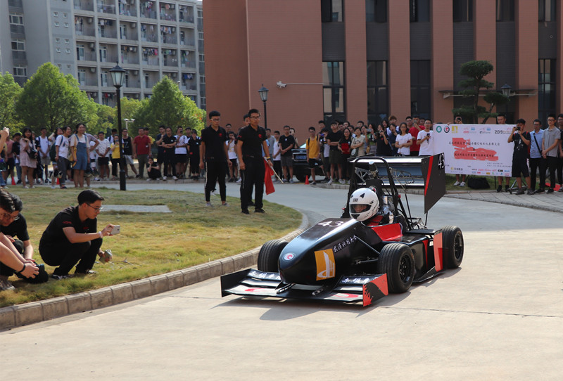 揭幕前,现场通过短视频播放了2019赤骥车的设计、制作过程。车队从零开始,通过调研学习,队员们进行了初步的参数选型及结构设计,然后通过结构与性能的分析,进行实测与实际总装,新车终于落地。今年八月,赛车出战襄阳中国大学生巴哈汽车大赛并顺利完赛,获全国三等奖,“赛车凝聚了一群年轻队员的不懈努力、汗水和智慧。”