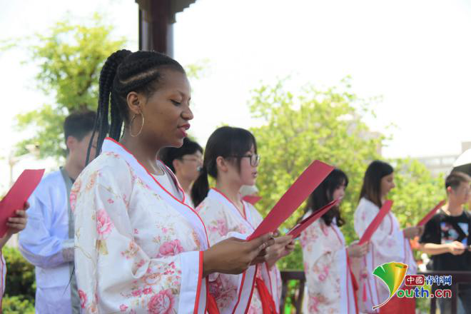 古筝与笛箫齐鸣,汉服共诗词同韵,来自巴基斯坦和津巴布韦的7位留学生与8位中国学生身着汉服共同朗诵《浣溪沙》。笛箫协会的中国学生熊世涛、席佳辰伴奏,一曲《美丽的草原我的家》被演绎的婉转而深情。这样一场带着几分“洋”味的诗词朗诵,成为龙舟节一道别样的风景。