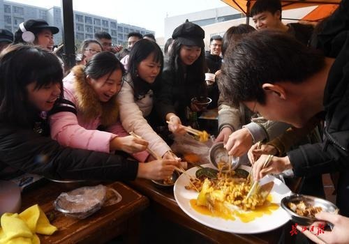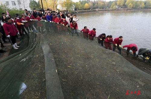 据了解,沁湖鱼宴已成为该校的每年年终的特色活动,每年校方都要在校内150亩的湖域内,投入10万元用于买鱼苗、饲料以及看护养殖。此外,年底吃鱼的传统象征着年年有“余”,这也是让辛苦工作学习一年的师生们享受学校特有的福利。(记者 李子云 摄影报道)