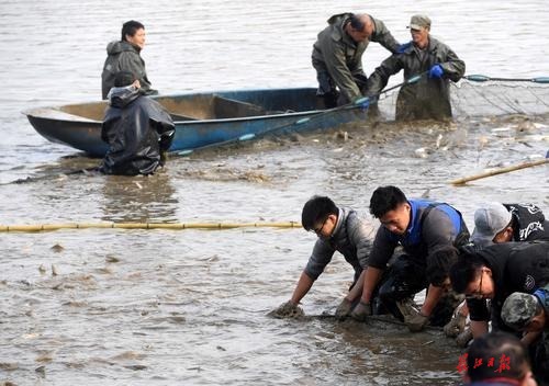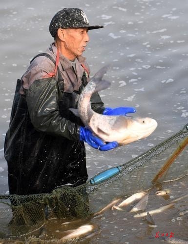 长江日报融媒体12月24日讯 24日,js33333线路登录第四届“沁湖捕鱼节”拉开序幕。上午8时许,伴随着一声声嘹亮的号子声,后勤集团的师傅鱼贯入水,拾起沉入湖中的渔网,由北至南,开始收网。来自各学院的15名学生自愿者,穿着下水衣,跳下水去,助后勤师傅们一臂之力。