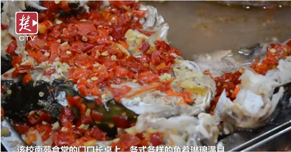 剁椒鱼头、红烧鱼块、糍粑鱼、酸菜鱼糕、鱼丸……当天十一点,该校南苑食堂的门口长桌上,各式各样的鱼肴琳琅满目,等候着师生们的光临。