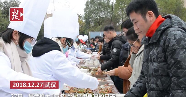 楚天都市报12月27日讯(记者肖杨 通讯员陈孖川 视频剪辑赵鹏 摄像 金辰圣 林瑞焜)天空飘着蒙蒙细雨,却挡不住武科大师生吃鱼的热情。27日,是武科大4万名师生享用鱼宴的日子。