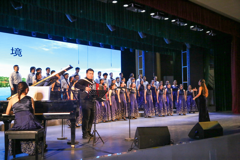 音乐会在优雅的钢琴伴奏中拉开序幕。十余首经典曲目以武科大“沁湖文化”为主线,由四“jing”——歌怀敬畏、明镜思齐、涤净心灵、宁静致远组成四个篇章。《O LOVE》《我想念你妈妈》《For the beauty of the earth》三首思念、感恩歌曲表达了“敬”, 悲壮的《大鱼》、婉约的《城南送别》、轻快的《Libertango》展示了“境”,《Earth song》《我喜欢》《听泉》三首平和轻盈的歌曲呈现了“净”, 悠扬的《Sure on this shining night》《贝加尔湖畔》《Can you hear me》构成了“静”。