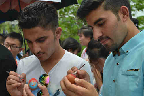 在鸡蛋上绘制彩色花纹,和众所周知的吃粽子一样,同为中国传统纪念屈原的文化习俗。在汽车学院组织的“鸡蛋文化”现场,蛋壳上涂鸦充满着趣味,桌面上随处可见身着各式“彩衣”的小鸡蛋。来自国际学院的留学生爱嘉、爱拉在鸡蛋上认真地涂涂画画。