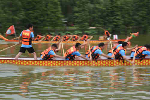 “冲波突出人齐譀,跃浪争先鸟退飞。”在波光粼粼的沁湖上,“沁湖连心·同舟共济”龙舟友谊赛激烈举行。湖边呐喊声阵阵,由该校本科生和研究生组成的两支龙舟队在湖上你追我赶。