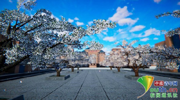 层层叠叠的樱花徐徐绽开,远处是错落有致的校园建筑,随着头部的旋转,在 VR的世界中就能一览校园的樱花景致,这便是武科大虚拟现实俱乐部今年推出的视觉新体验。