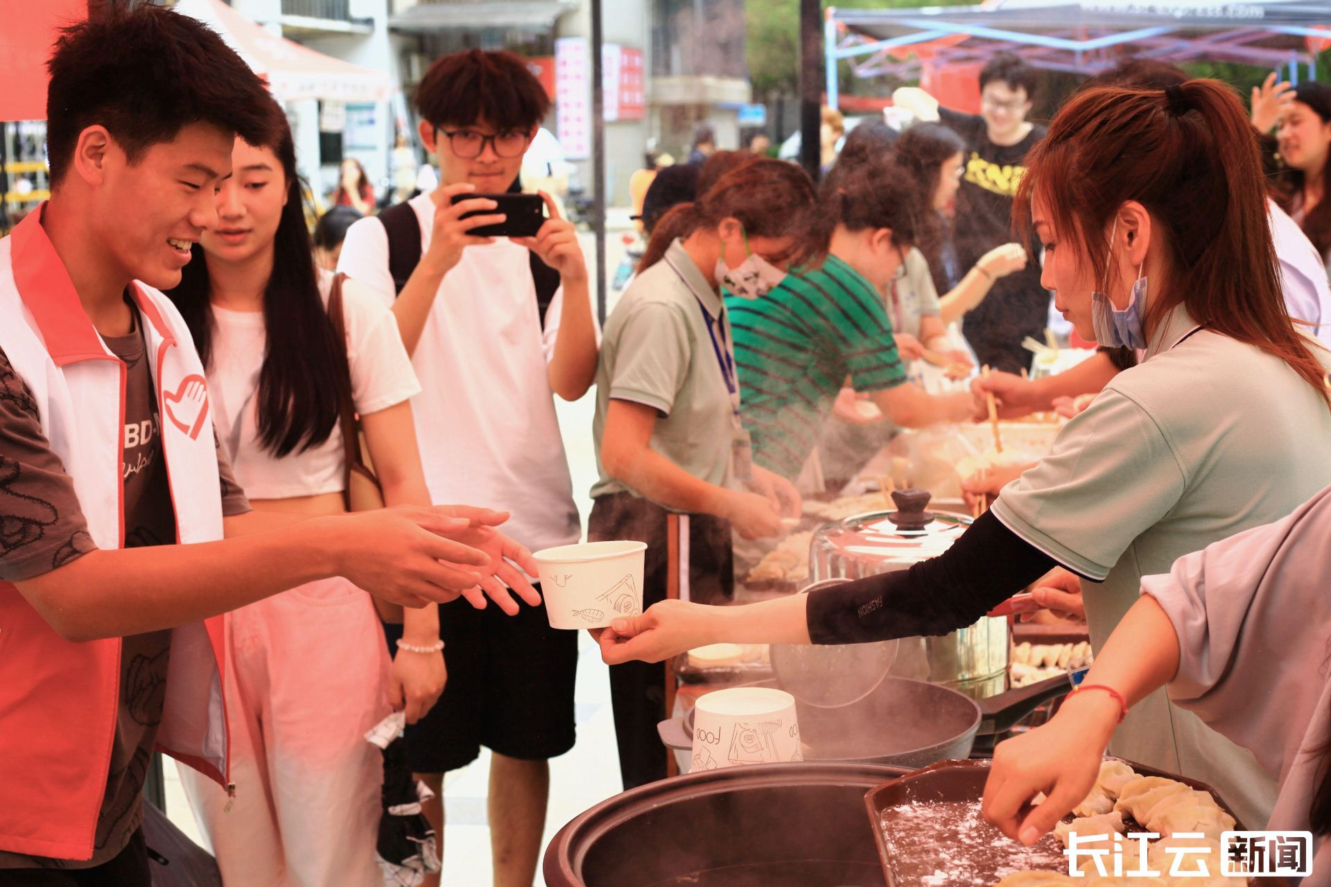 国际学院毕业生陈泽暄回寝室的路上注意到这一活动,与他相熟的宿管阿姨笑着将一份她亲手包的饺子送给他并说道:“送给我们武科大未来的骄子!”。陈泽暄眼眶一热,随即感慨道:“这是最不一样的饺子,充满着学校的爱意,是最好的毕业礼物!”
