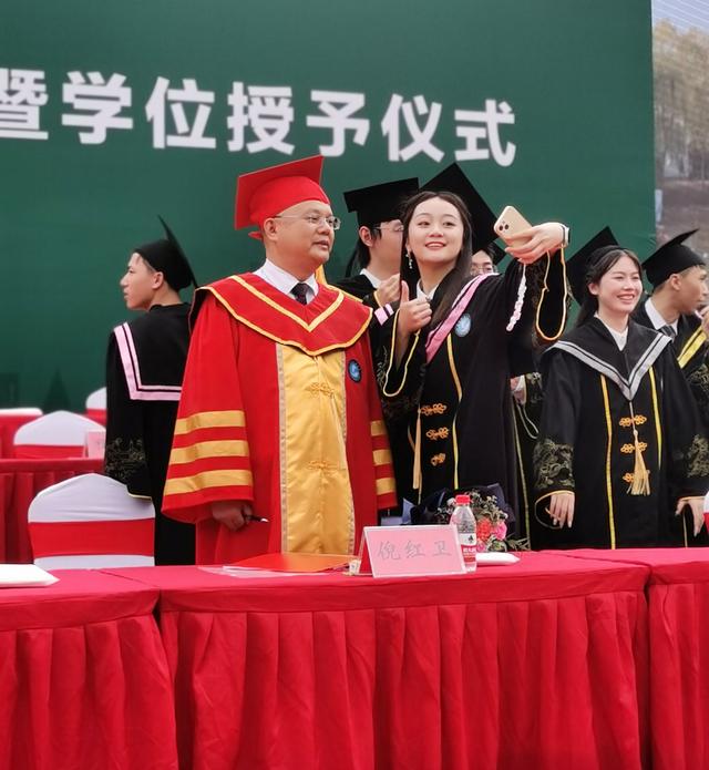毕业典礼仪式结束后,校长倪红卫成学生、家长合影“背景板”。