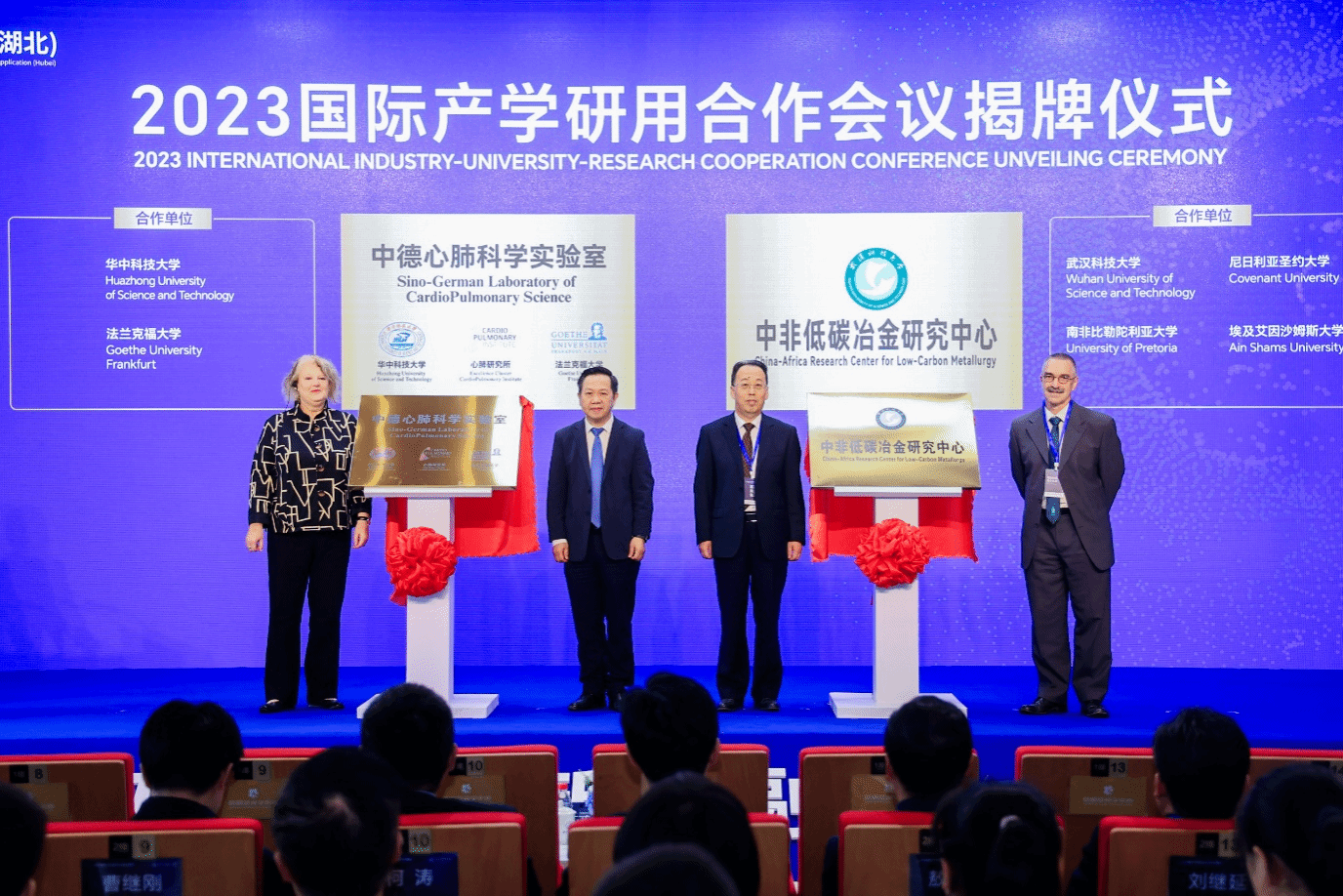 11月4日,2023国际产学研用合作会议(湖北)在武汉开幕。湖北省委常委、常务副省长邵新宇,湖北省教育厅厅长周静出席会议。会上,js33333线路登录副校长马腾与南非比勒陀利亚大学Robert Cromarty教授共同为“中非低碳冶金研究中心”揭牌。