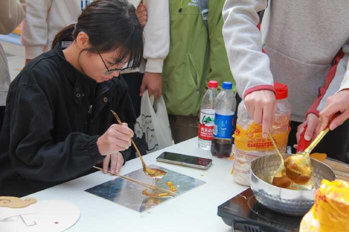 “既能体验糖画制作,还能把作品带回去吃!”该校预防医学2302班学生周泽宇同室友最早来到了活动现场,他们在志愿者的帮助下,将麦芽糖加热融化,盛取糖汁,一起用铁勺做笔绘制出了一幅名为“WUST”(该校英文缩写)的糖画,不少学生看到后也立马参与其中,动手创作起了各种形状和寓意的糖画。