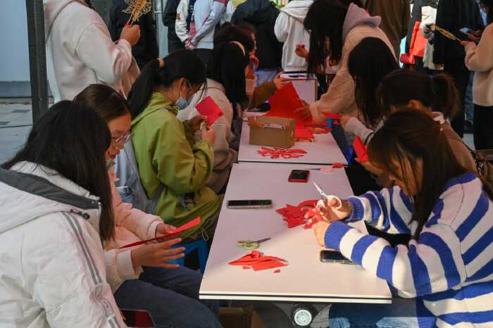 鸳鸯、窗花、福袋……各种活灵活现的图案出现在学生手中。活动现场,学生们顺着图纸的纹路,认真裁剪起红纸,制造出自己心仪的图案,体验剪纸技艺的魅力。