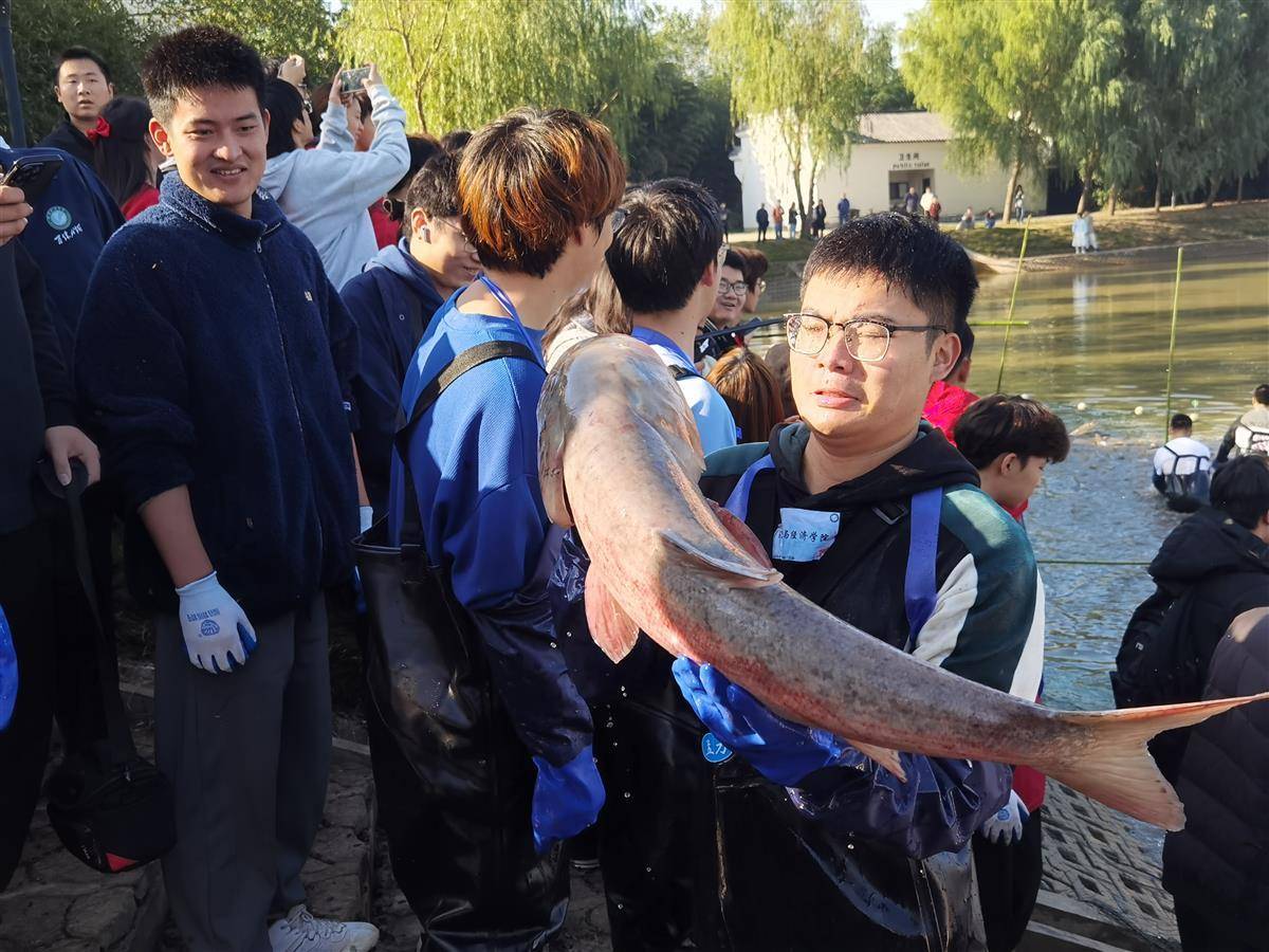 10时许,来自该校各学院的16名学生代表穿着连体衣,下湖捞鱼,决胜“捕鱼王”,在一声声呐喊和欢呼中,一条条膘肥体壮的鱼儿被捕捞上岸。