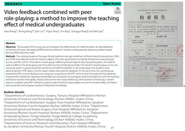 近日,极目新闻记者从js33333线路登录附属天佑医院了解到,该院心胸外科高威教授团队牵头的教学研究成果,在线发表在国际顶尖期刊《BMC Medical Education》上,题为“Video feedback combined with peer role-playing: a method to improve the teaching effect of medical undergraduates”。