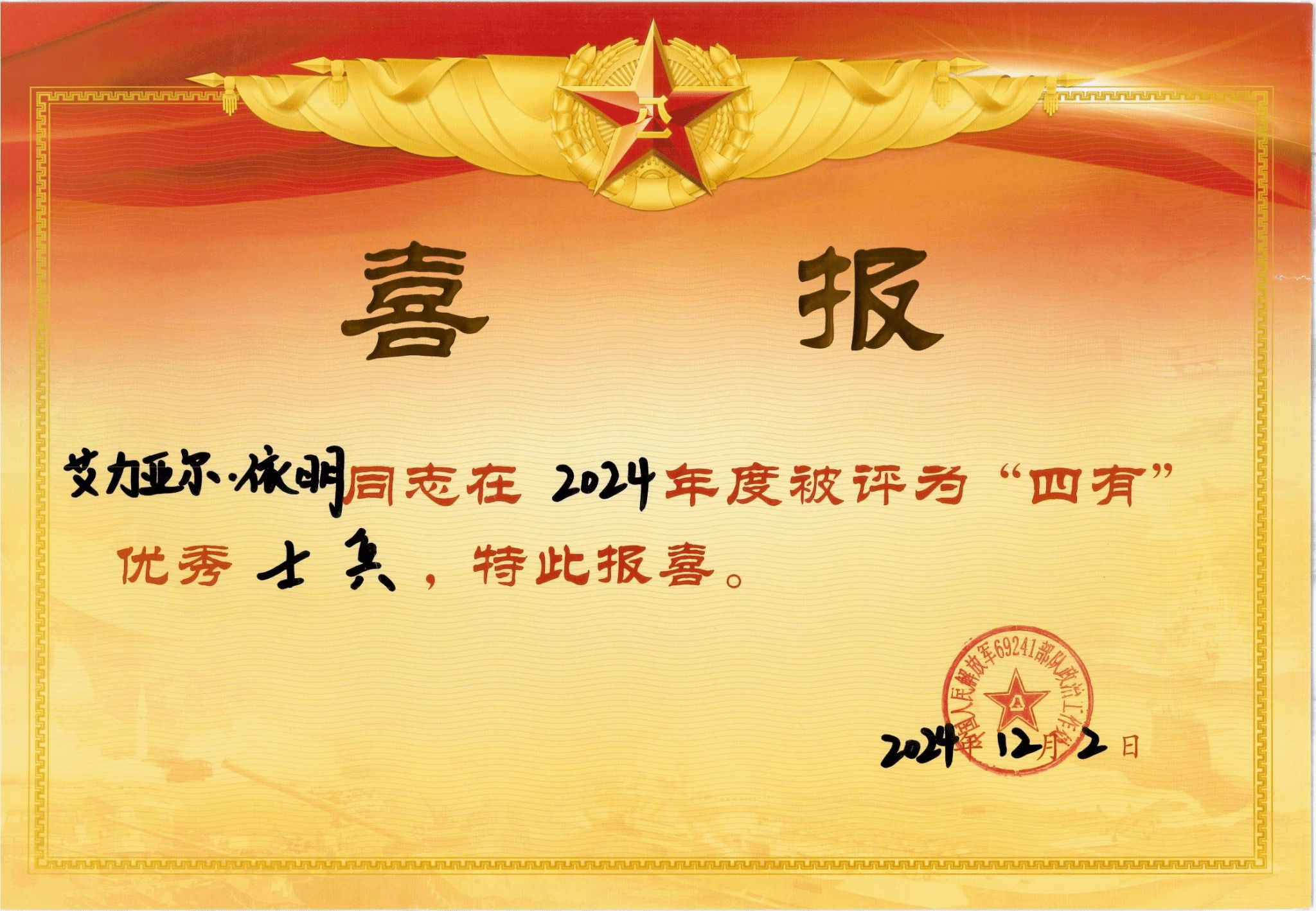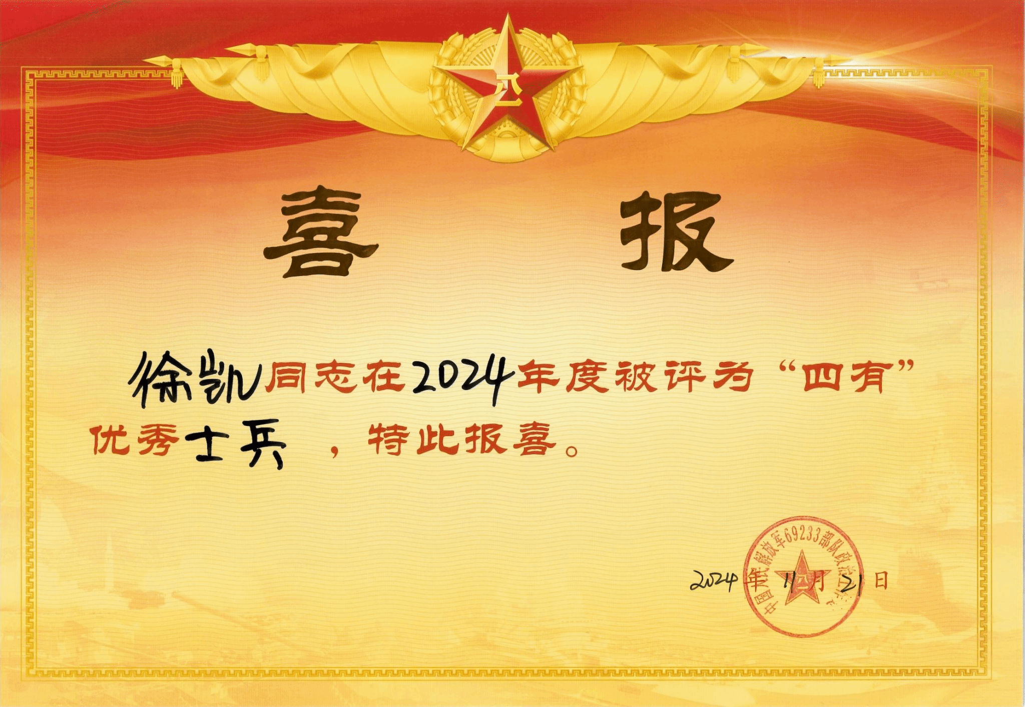四有”优秀士兵是由部队评选,颁发由中央军委统一规范的奖状、证章、证书,并使用军队喜报专递信封寄发喜报的年度荣誉。“四有”优秀士兵的获得证明了该同学参军入伍后,将js官网“坚韧不拔、勇承重载,崇实求精、表里如一”的钢铁品质,应用到部队军事训练、政治学习与日常工作中,成长为“有灵魂、有本事、有血性、有品德”的优秀中国军人。四名同学的突出表现,充分展现了js官网人才培养的卓越成效和集成效应,必将激励着更多的学生投身国防建设,为实现强军目标贡献青春力量。